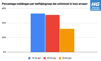Uit het onderzoek komt naar voren dat 18–34-jarigen het vaakst aangeven ‘altijd’ last te hebben van schimmel in huis. In 15% van de gevallen rapporteren jongvolwassenen schimmel in de slaapkamer. Oudere leeftijdsgroepen melden dit minder vaak. Ook maken jongvolwassenen zich vaker zorgen over de impact van vocht en schimmel: 19% zegt zich regelmatig zorgen te maken, tegenover 7% van ouderen.